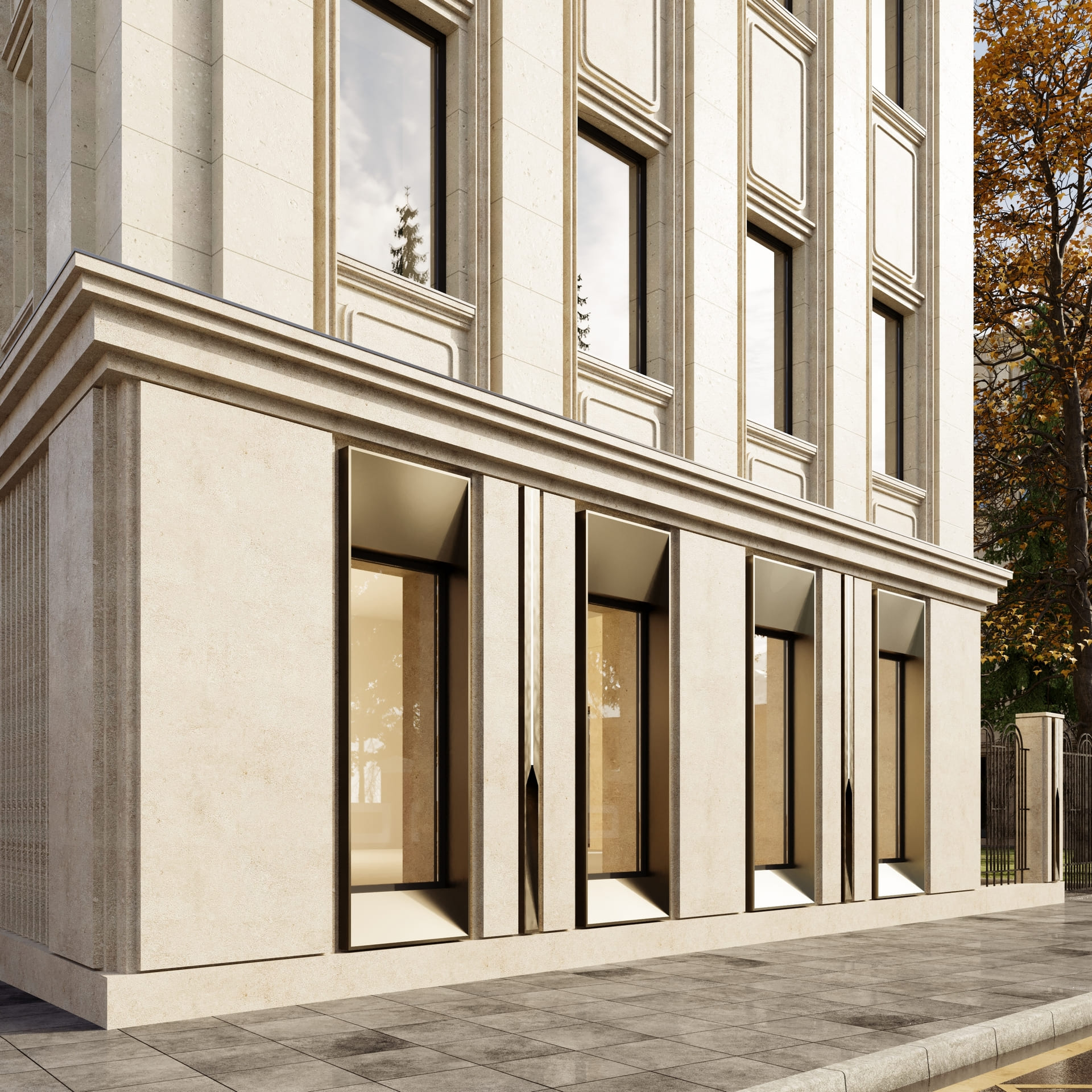 Фасады бизнес-центра выполнены в неоклассическом стиле с применением натурального камня, архитектурного бетона и металлических элементов в качестве акцентов. Территория внутреннего двора и прилегающего сквера будет благоустроена, атмосферу дополнит деликатная архитектурная подсветка.