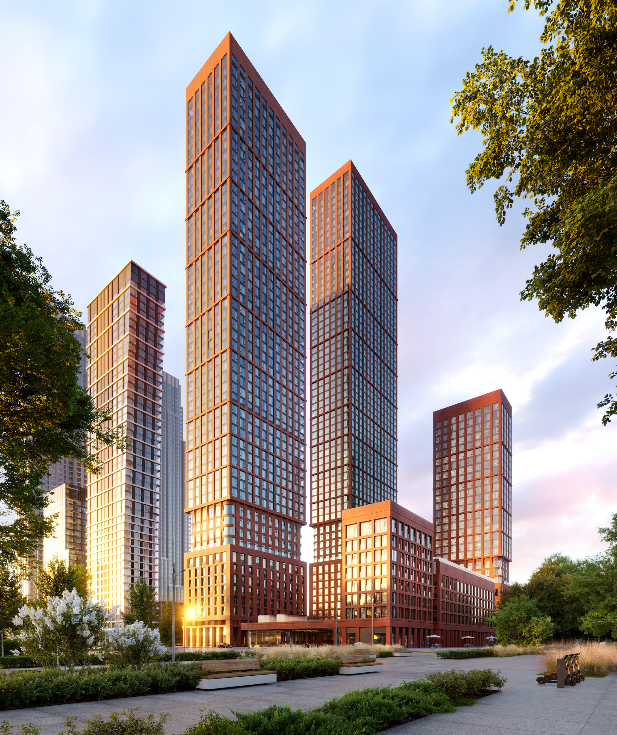Оригинальным решением стал стилобат, объединяющий пять жилых секций высотой пять, восемь, 28, 52 и 59 этажей. На уровне первого этажа он будет разделен на несколько объемов со вторым светом и акцентным навесом из массивных балок. Архитектурную концепцию нового жилого квартала разработало бюро Kleinewelt Architekten.