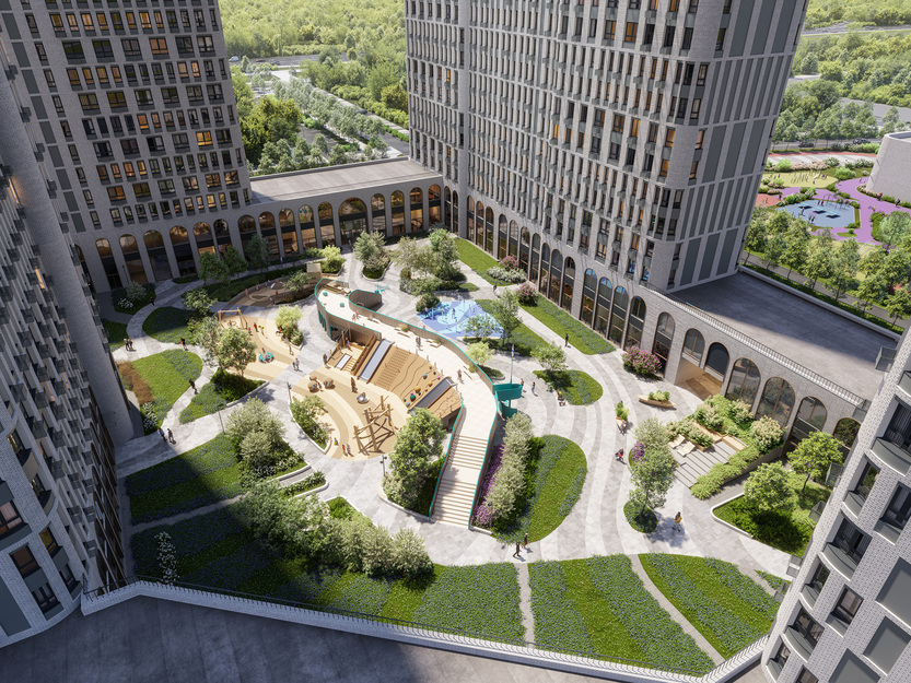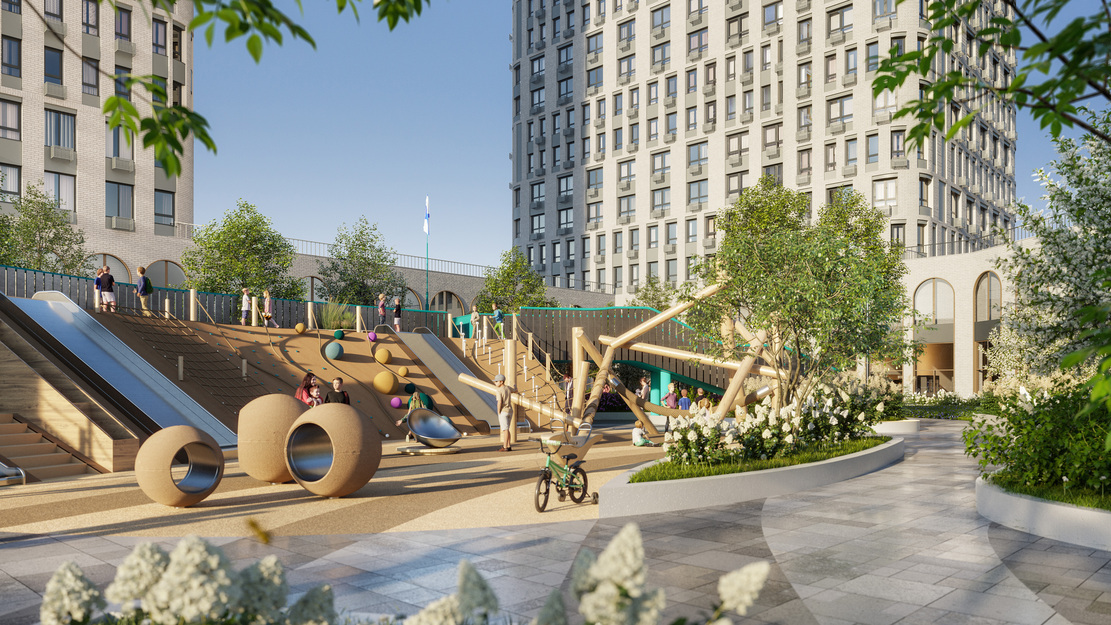 Комплекс включает три жилых квартала, где будет порядка 5 000 квартир, закрытые дворы-парки, школу и детский сад, пешеходный бульвар для прогулок с велодорожками, беговыми маршрутами и зоной ритейла на первых этажах. Рядом построят бизнес-центр с собственной инфраструктурой. Под благоустройство отведено 64% территории комплекса.
